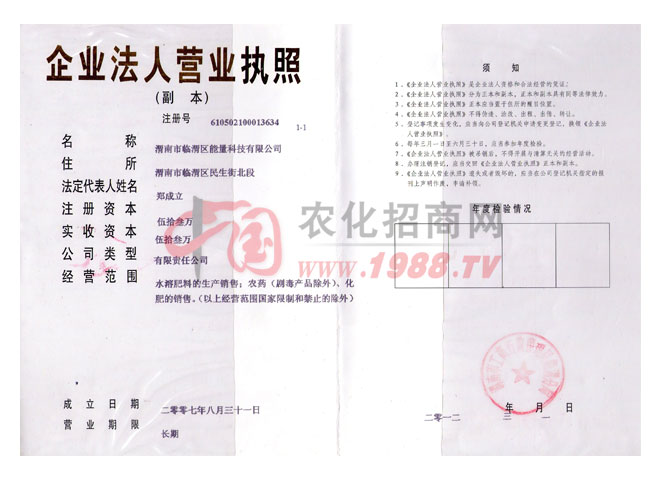 陜西渭南能量科技有限公司,是一家大中型科研、生產(chǎn)、經(jīng)營(yíng)綜合性液體肥企業(yè)。公司擁有一批高的科技專家和技術(shù)骨干力量。并有先進(jìn)型多組合生產(chǎn)線,年生產(chǎn)萬(wàn)噸以上綠色環(huán)保型沖施肥和葉面肥。