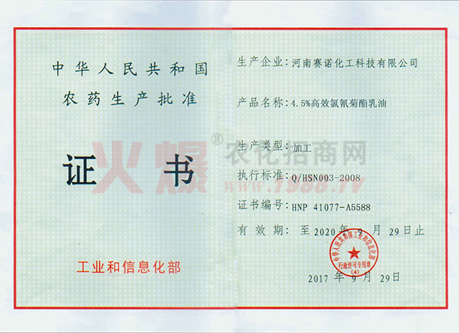賽諾公司于2011年3月在國(guó)家農(nóng)業(yè)部進(jìn)行了豐之盼產(chǎn)品的登記申報(bào),并于2014年4月25日獲得了國(guó)家的正式農(nóng)藥登記,登記號(hào)為PD20141062。這是國(guó)內(nèi)第二家取得制劑正式登記的廠家。也是第二家把誘抗素商品化生產(chǎn)的廠家。