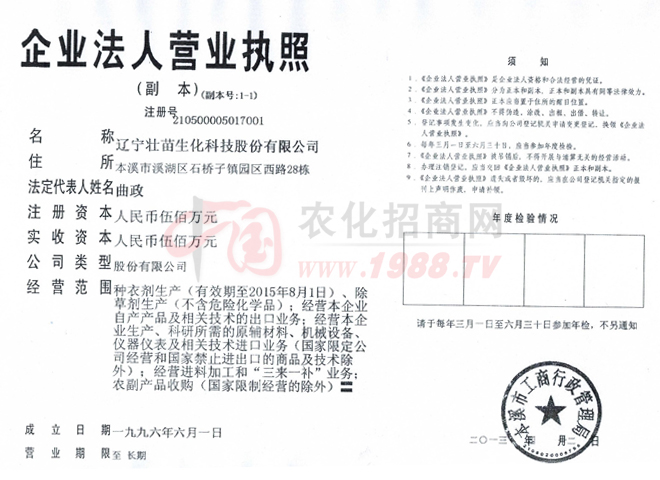 遼寧壯苗生化科技股份有限公司創(chuàng)建于1996年,位于遼寧省本溪經(jīng)濟(jì)開發(fā)區(qū)濱河工業(yè)園區(qū),是國(guó)家發(fā)改委批準(zhǔn)的定點(diǎn)農(nóng)藥生產(chǎn)企業(yè),是以研發(fā)、生產(chǎn)、銷售系列種衣劑、特色除草劑等農(nóng)化產(chǎn)品為主的高新技術(shù)企業(yè)。